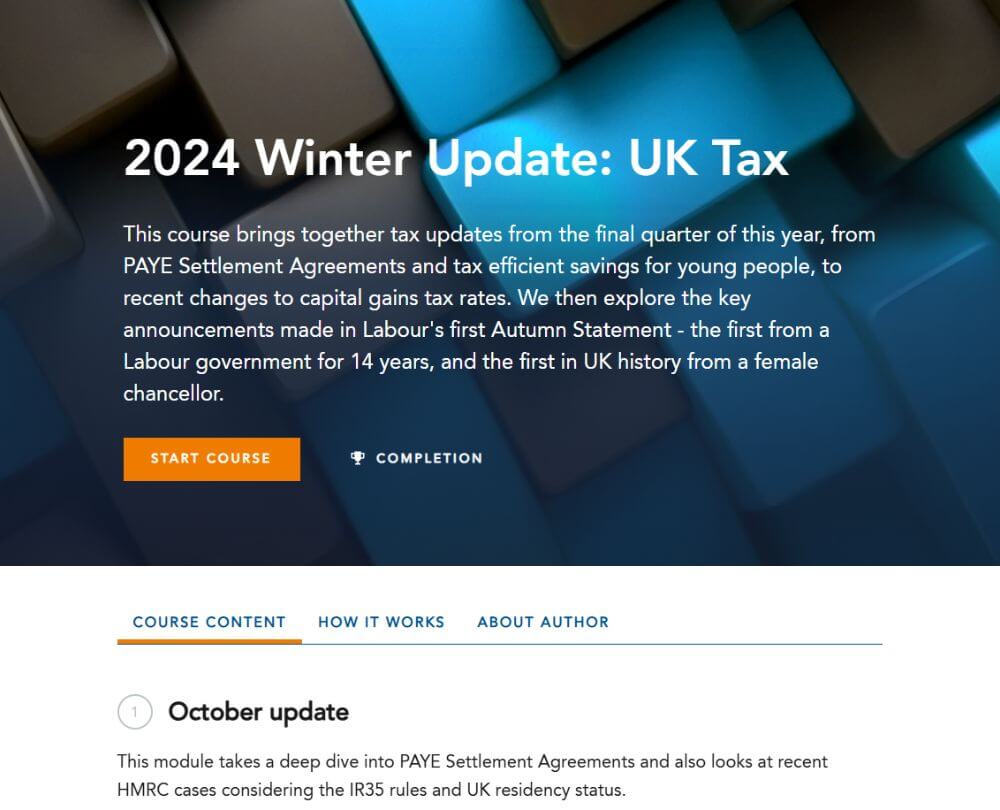 Part of a series of Quarterly UK Tax Updates. This course contains monthly updates from October, November and December 2024, covering legislation, consultations and tax cases. It also takes a deep dive into the Autumn Budget, PAYE Settlement Agreements and capital gains tax.