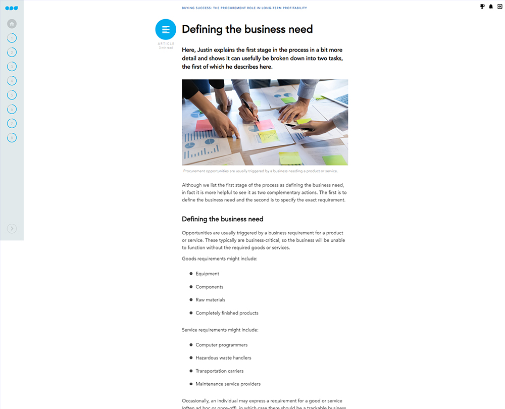 In this course, you will find out what makes a good procurement process. It will help you establish and maintain strong relationships with your suppliers and ensure you have the appropriate procurement documents. You’ll learn how to successfully negotiate at different stages of the procurement process and understand why constantly reviewing the process is important for profitability.