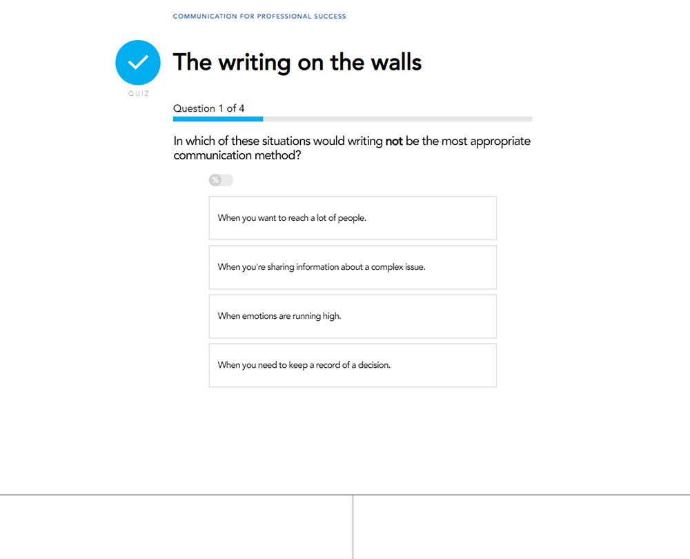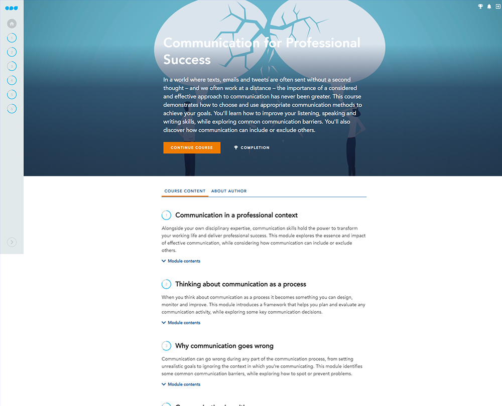 This course demonstrates how to choose and use appropriate communication methods to achieve your goals. You’ll discover how to plan and evaluate your communication activity, while improving your listening, speaking and writing skills. You’ll also be able to overcome barriers and successfully communicate across different cultures and challenging professional situations.