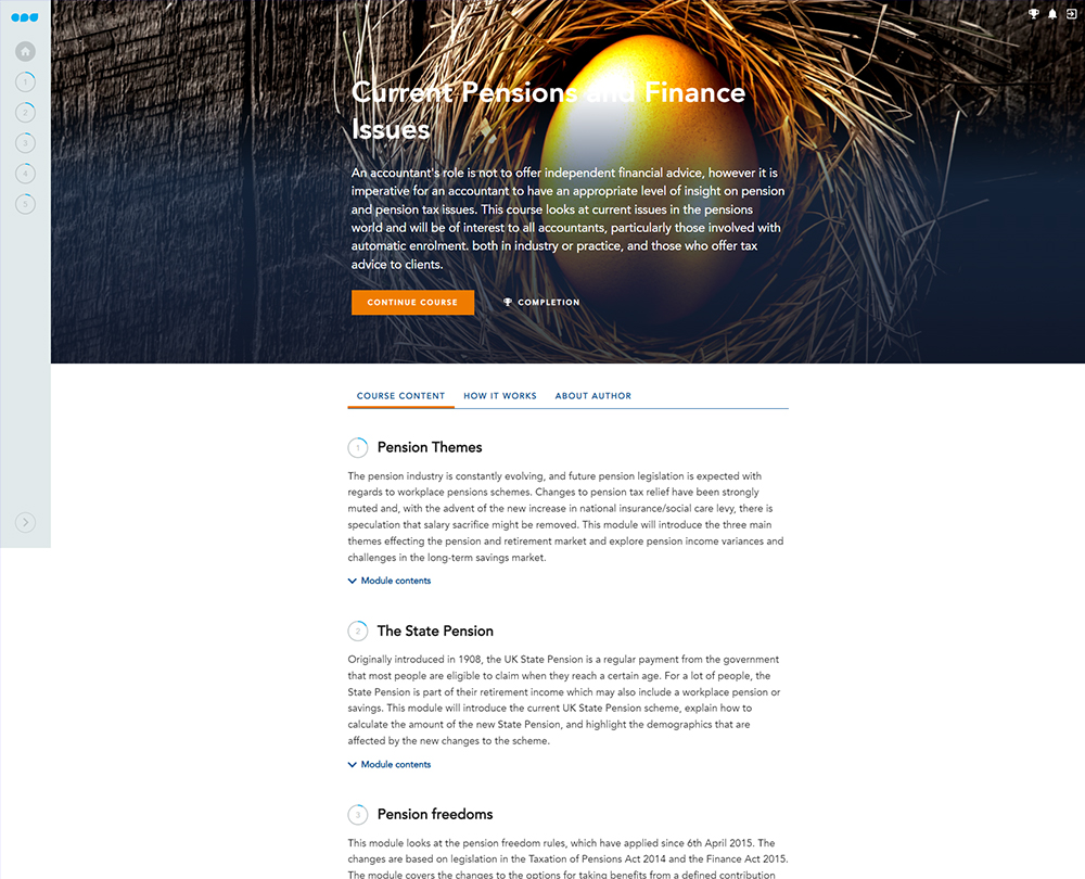 This course will get you up to speed with recent changes, as well as serving as a roadmap for upcoming developments. You will learn about automatic enrolment and the various allowances linked to pension contributions, and you will be able to advise on available reliefs. Having completed this course, you will be able to confidently provide assistance on a subject that’s on everyone’s minds.
