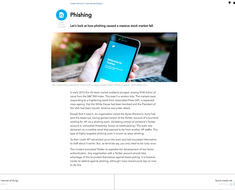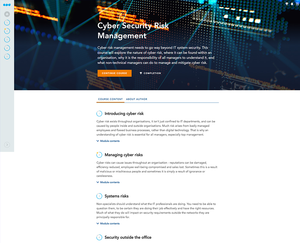 This course offers a detailed overview of cyber risks and the threats to your organisation and explores why cyber security is the responsibility of all managers. The course will help you devise effective strategies and gather appropriate resources for mitigating risks both within and outside the office and prepare your organisation’s response to any cyber threats.