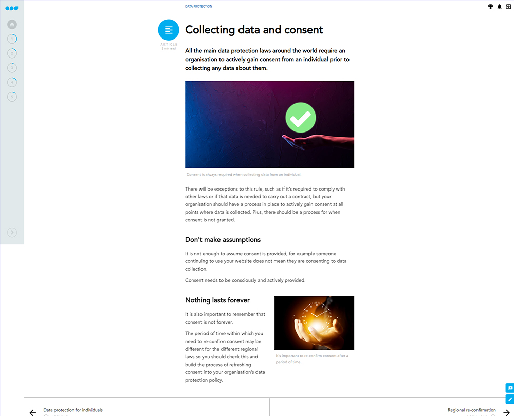 Revised and up to date for 2025. With increasing amounts of global data protection regulations, it’s important that organisations keep up. This course provides an overview of the key aspects of data protection from the main principles, to global regulations, to cookies and practical steps you can take today.