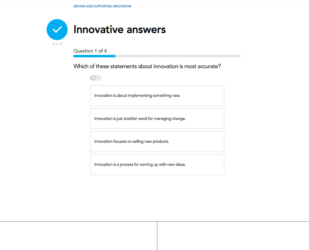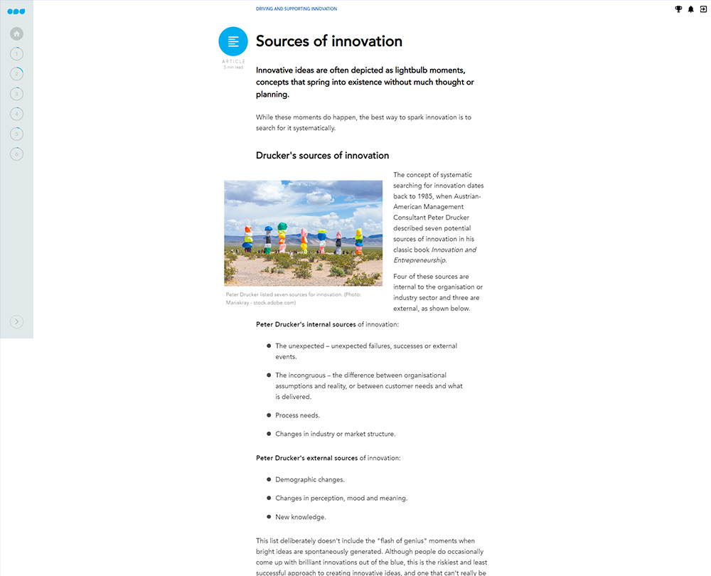 Innovation is all about generating and implementing new ideas – breaking the mould to deliver business success. This course shows you why innovation is important, how to create and select great ideas and how to realise them in your own organisation.