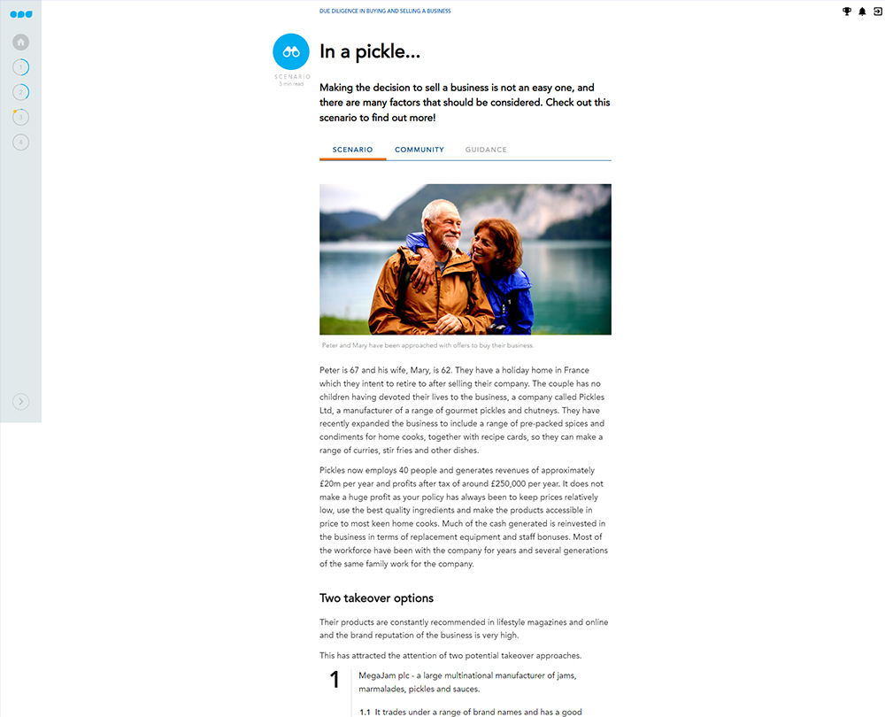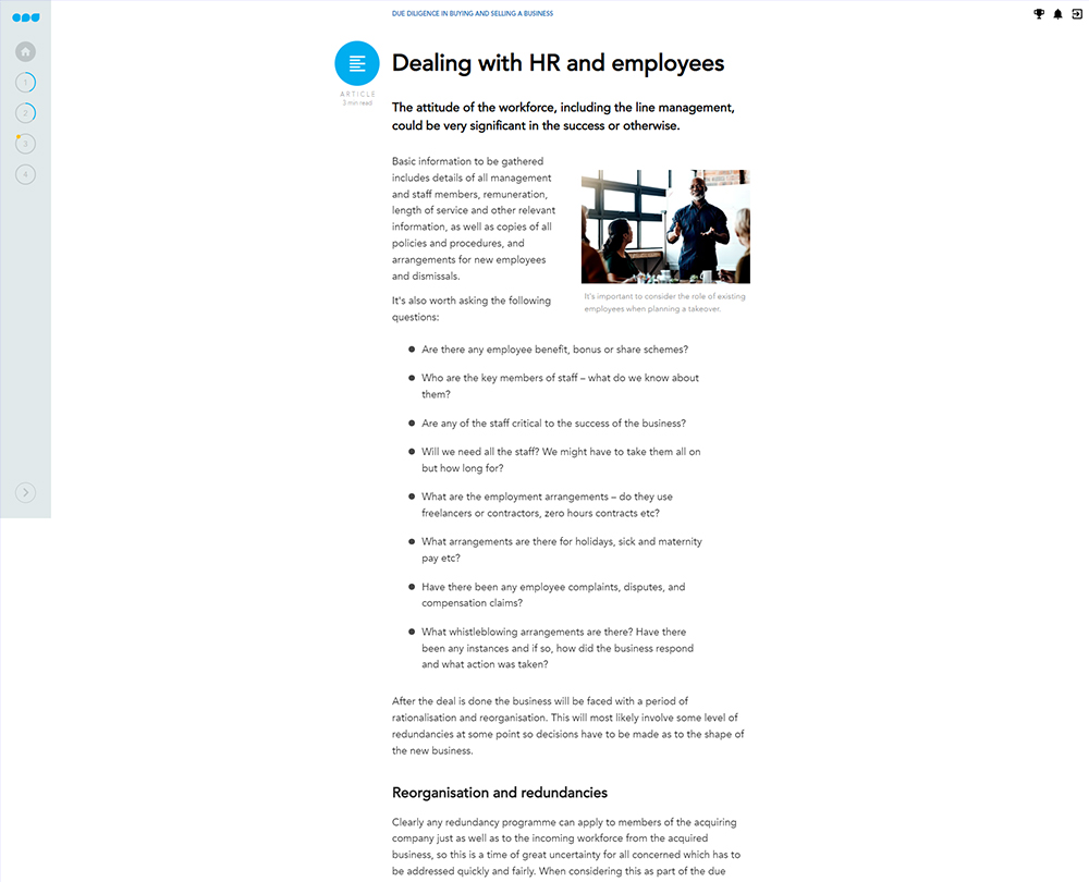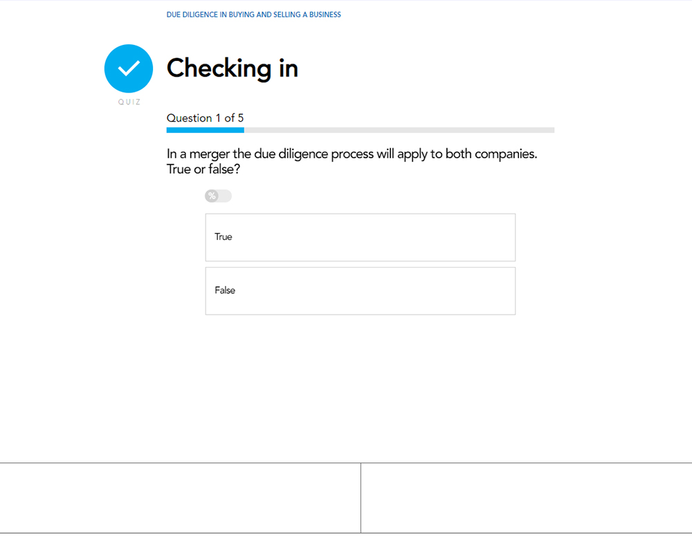 This course explores the process of due diligence from both the buyer and the seller’s perspective. You will learn the importance of due diligence for both parties and will consider the risks involved in buying or selling a business, and what you can do to minimise these.