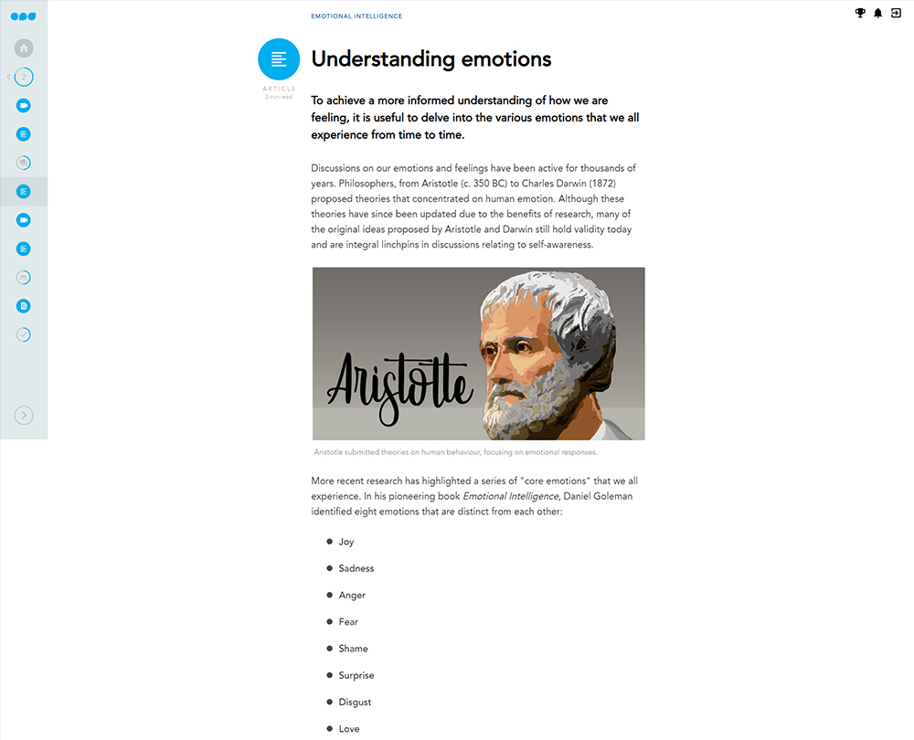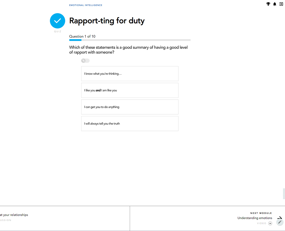 This course will guide you through the basics of EI and identify the role your emotions have on your performance. It looks at how you can improve your EI through self-awareness and self-reflection. Once we have a better understanding of ourselves, we can understand the emotions and build rapport with those around us, helping to create and sustain professional relationships.