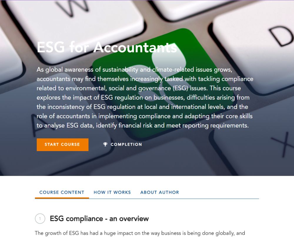 This course explores the impact of ESG regulation on businesses and the difficulties arising from the inconsistency of ESG regulation at local and international levels. It also looks at the role of accountants in implementing compliance and adapting your core skills to analyse ESG data, identify financial risk and help organisations to meet reporting requirements.