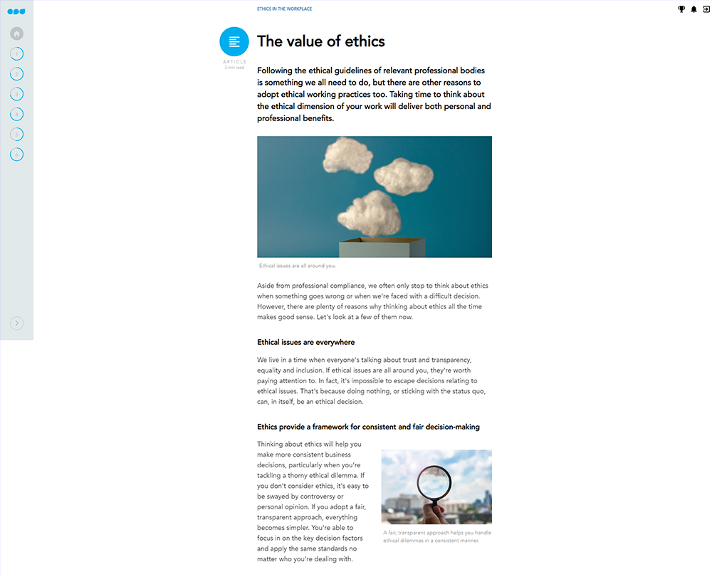 In a world full of grey areas and thorny dilemmas, acting ethically is far from straightforward. This course explores the concept of ethics and issues faced in the workplace. Discover how to adjust your own behaviour and promote ethical practices.