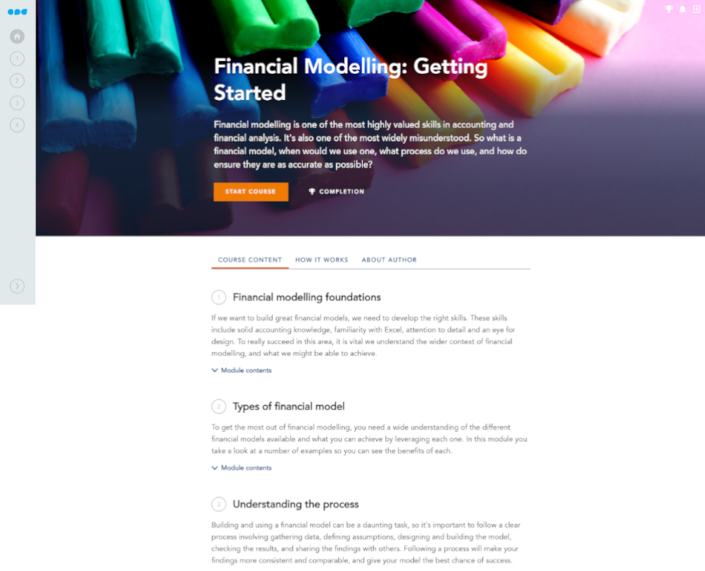 This course will help you to get started in financial modelling. You will learn how to choose the best model for your purpose, the process to follow to ensure consistency and comparability, and how to ensure that by following the standards and guidelines, your model will be easily understandable by colleagues.