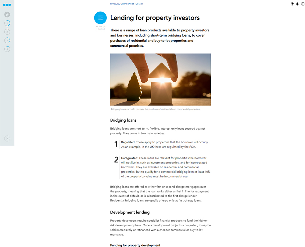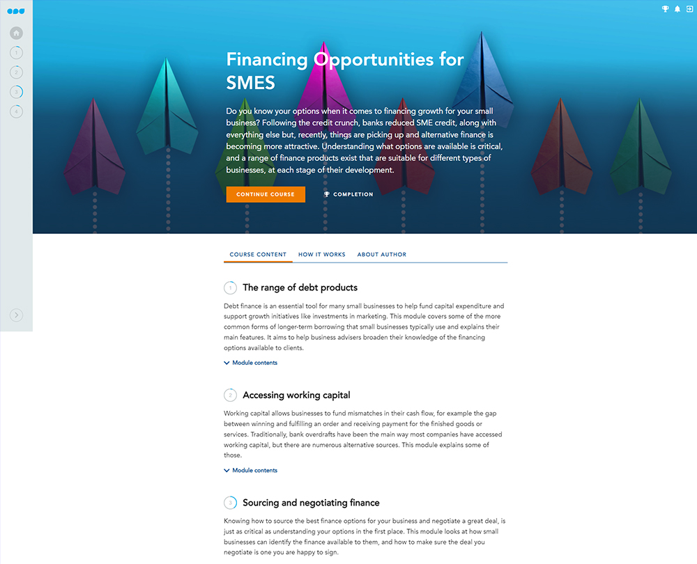 A growing range of finance opportunities for SMEs can make it difficult to decide which ones are right for you and your clients. This course takes a detailed look at a variety of financing options available for SMEs, including debt, working capital and equity funding.