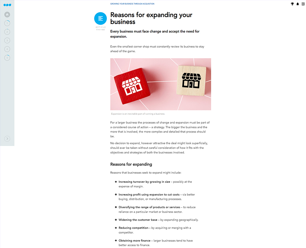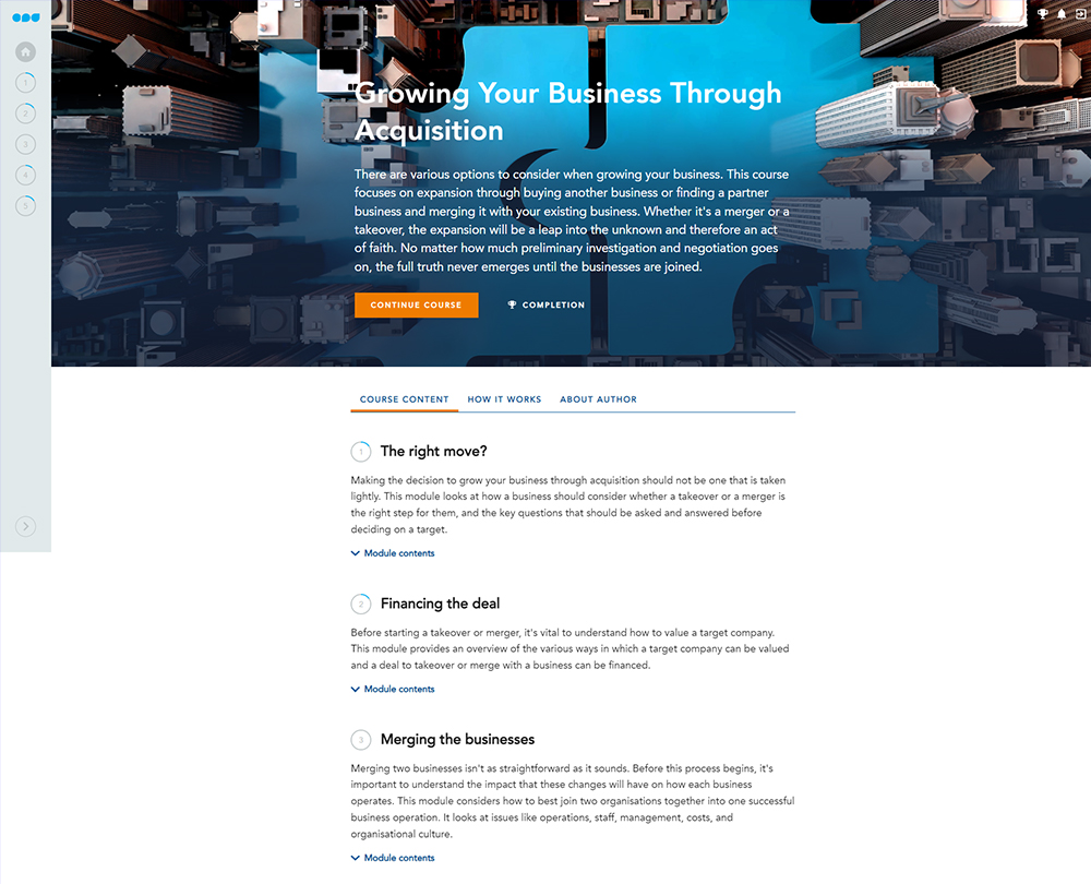 There are various options to consider when growing your business. This course focuses on expansion through buying another business or merging with a partner business. Whether it’s a merger or a takeover, expanding a business in this way requires a leap into the unknown; no matter how much preliminary investigation and negotiation you do, the full truth never emerges until the businesses are affiliated.