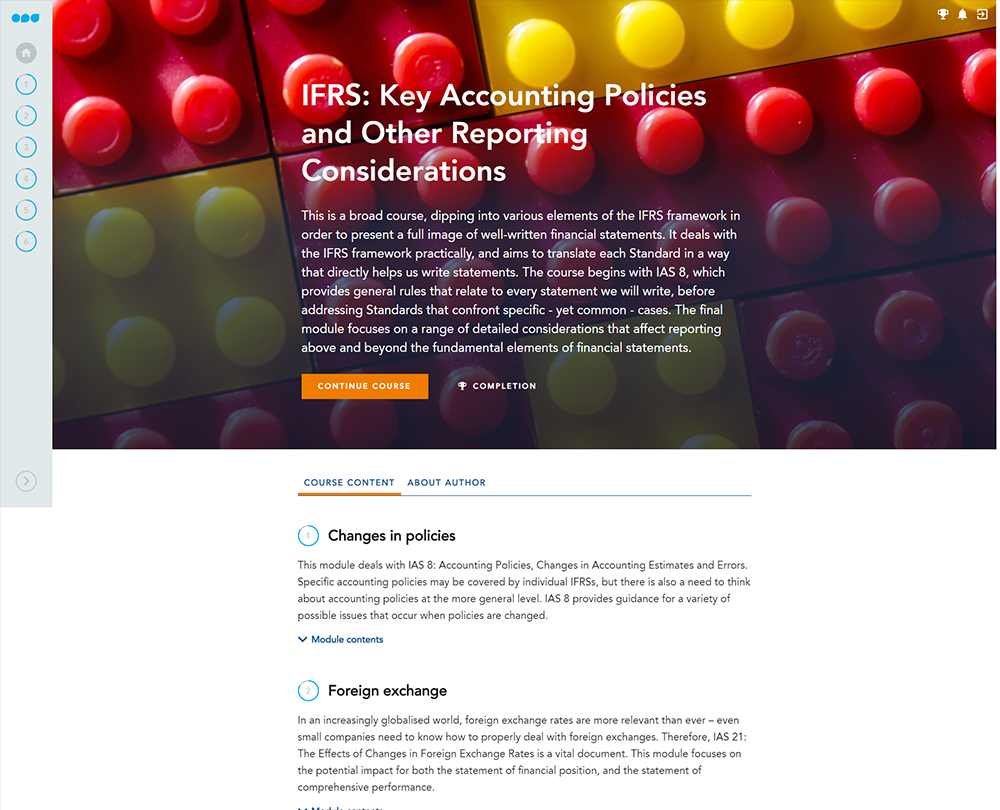 Now with a new module on IFRS 13: Fair Value Measurement, as well as video interviews with the authors and additional case studies, the course begins by looking in detail at the main source of guidance on accounting policies – IAS 8. It then takes you through other key issues in reporting including how to deal with foreign exchange transactions, how to handle events after the reporting date , related party transactions and measuring fair value.