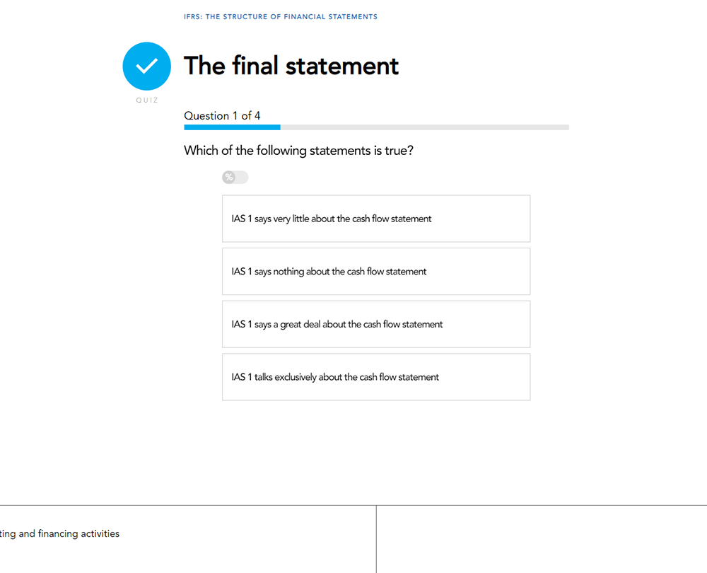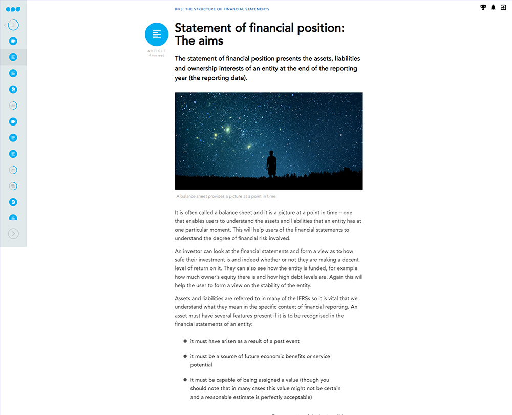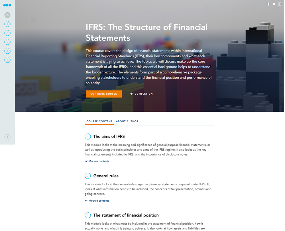 This course explains the design of financial statements within International Financial Reporting Standards (IFRS) and considers their key components, as well as what each statement is trying to achieve.