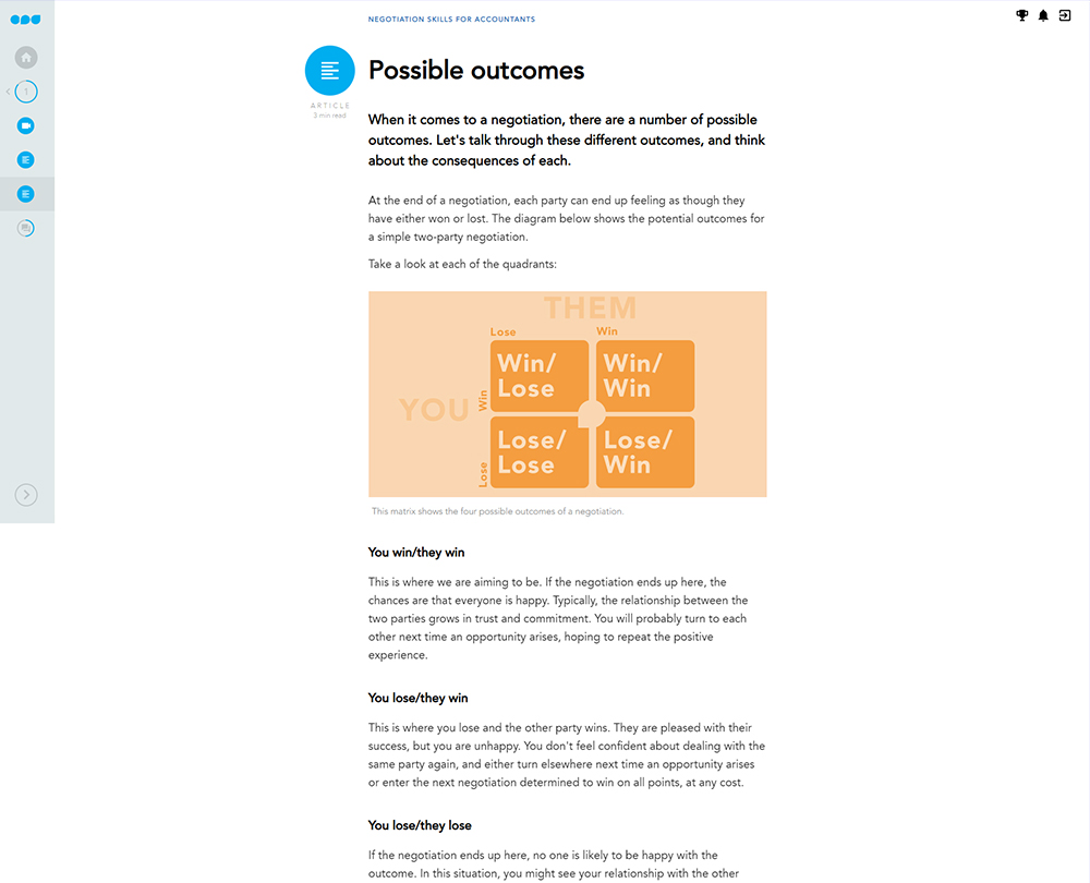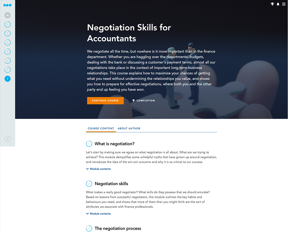 This course explains how to maximise your chances of getting what you need without undermining the relationships you value, and shows you how to prepare for effective negotiations, where both you and the other party end up feeling you have won.