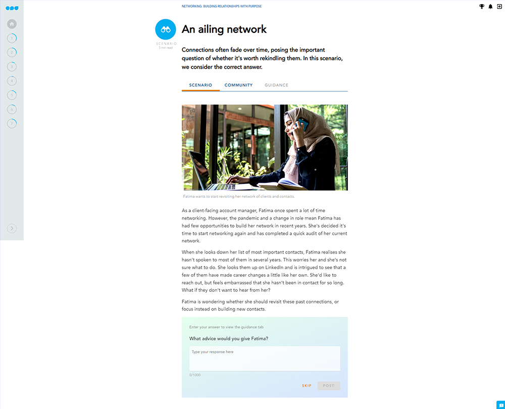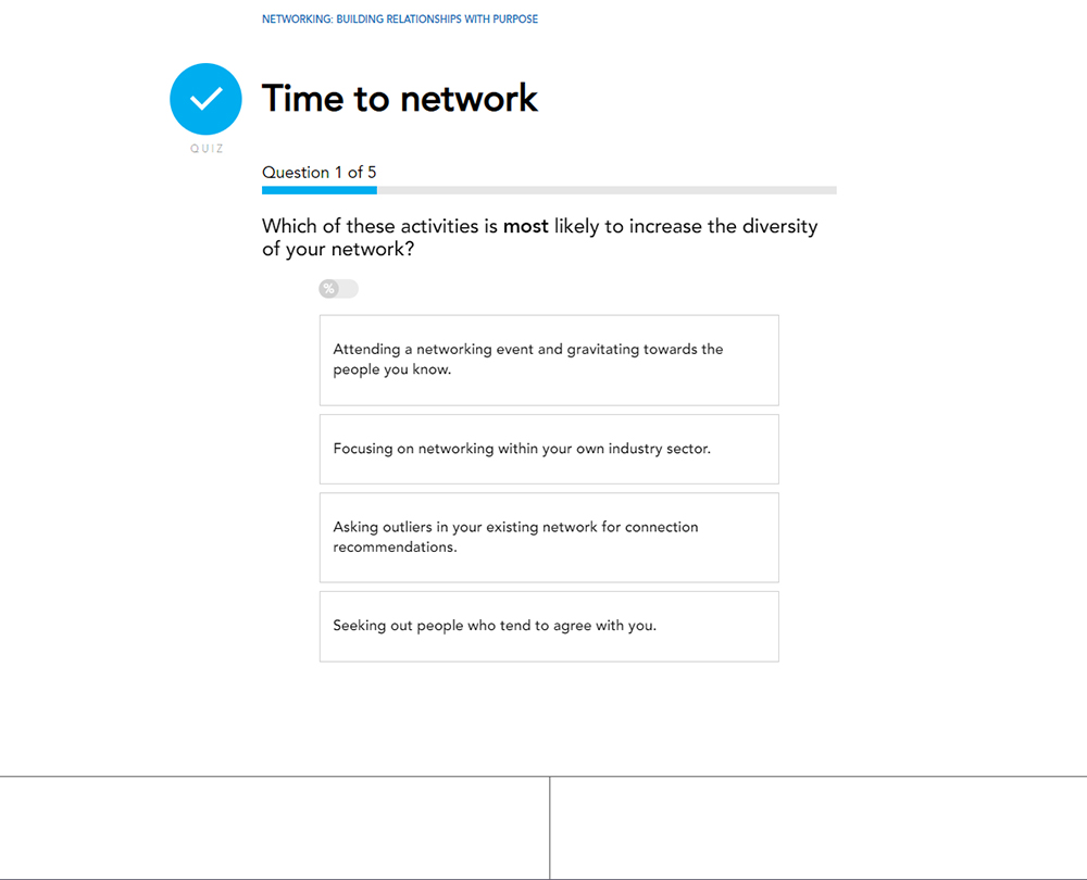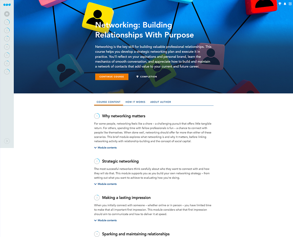 This course helps you develop a strategic networking plan and execute it in practice. It will enable you to reflect on both your aspirations and personal brand as well as teaching you the mechanics of smooth conversation. Discover how to build and maintain a network of contacts that help you achieve your career goals.