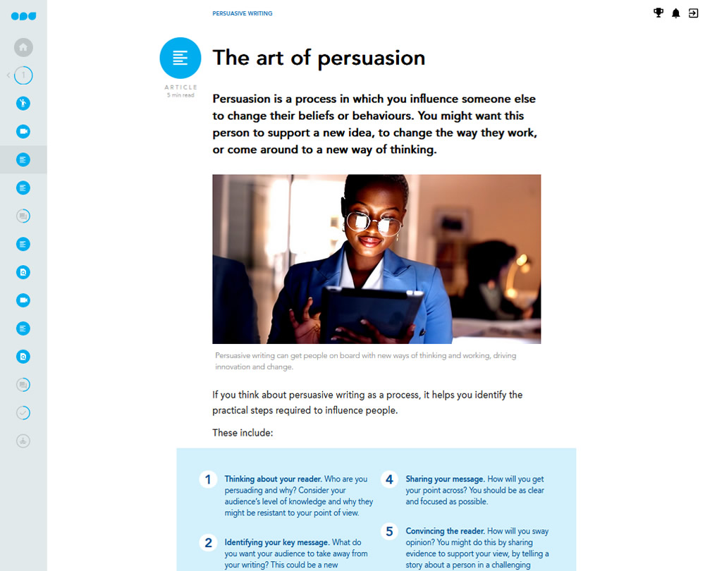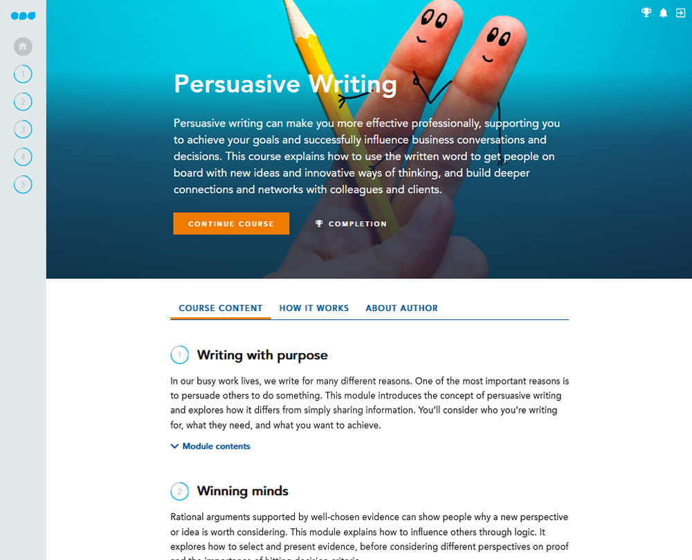 It will help you understand your audience, build convincing rational arguments and make personal and emotional connections. You will also look at structure and tone, grammar, consistency and editing, in order to develop a writing process that works for you.