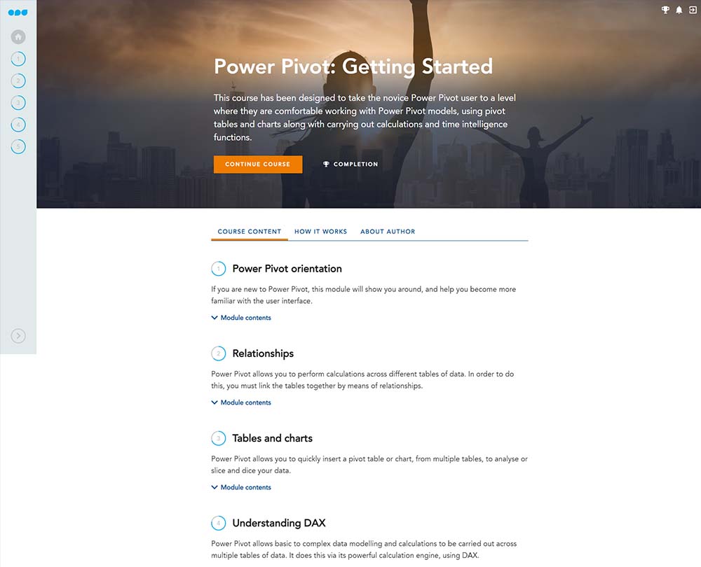 This course has been designed to take the novice Power Pivot user to a level where they are comfortable working with Power Pivot models and using Pivot tables and charts. You’ll also be able to carry out calculations and time intelligence functions by learning the basics of DAX.