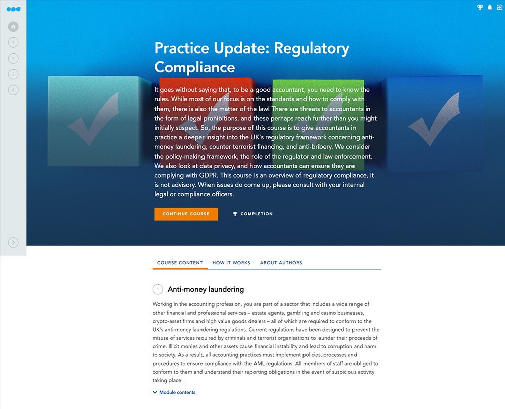 Revised and up to date for 2025. Accountants in practice are required to comply with some key UK regulations. This course gives you an insight into the UK’s regulatory framework and how to follow it to help tackle money laundering, bribery, financial crime and data protection.