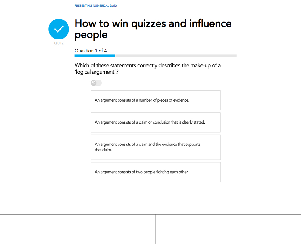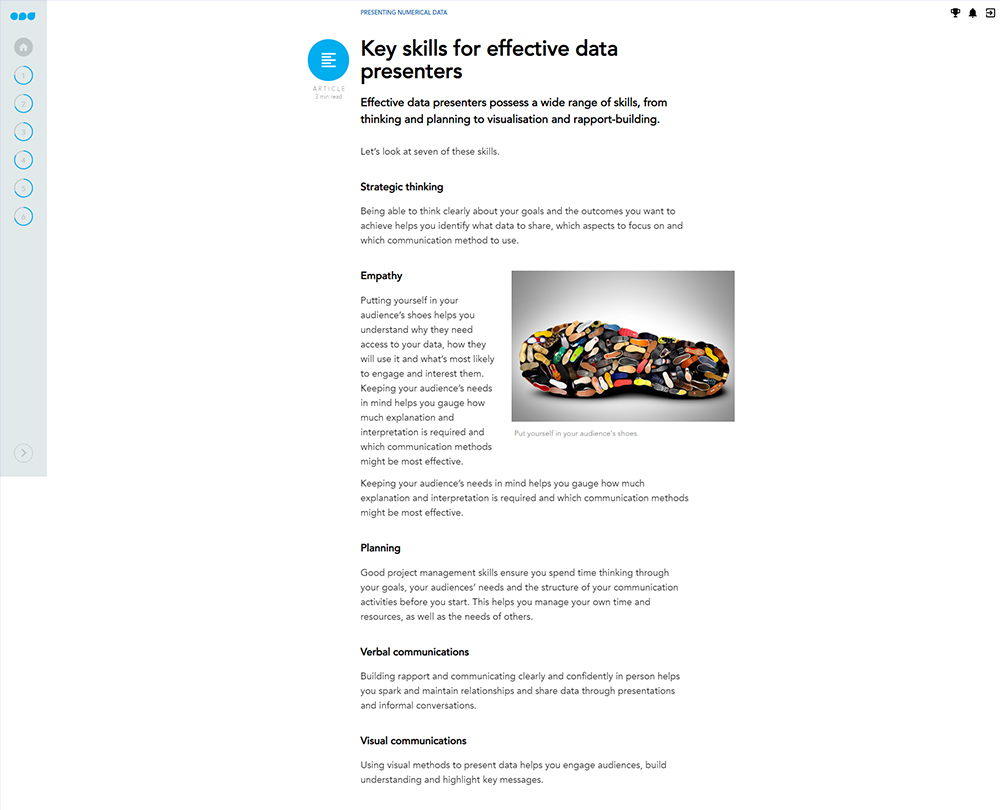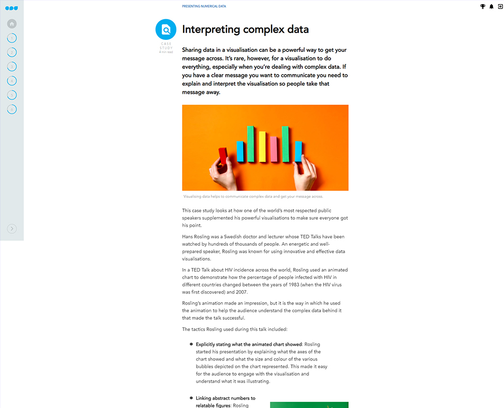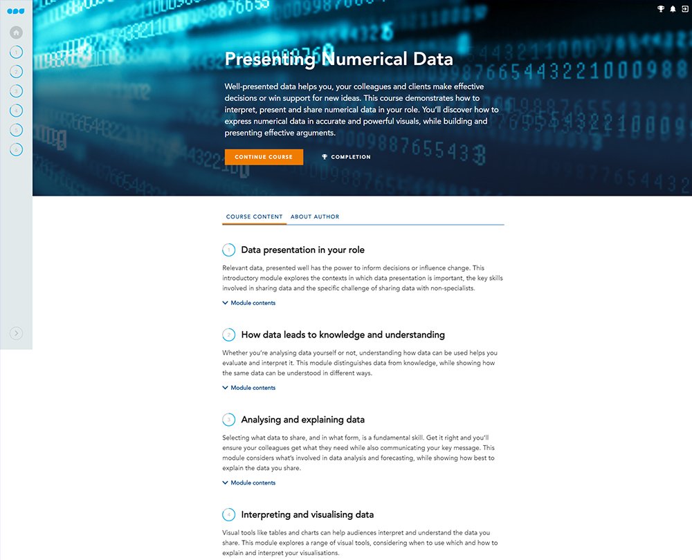 This course demonstrates how best to share and present numerical data to support your individual and organisational goals. You’ll explore how effective use of different types of data can enable informed business decisions and win support for ideas while considering your audience and the wider context. You’ll also discover the importance of analysing data, how to express numerical data through visuals, and how to share your data for persuasion and influence.