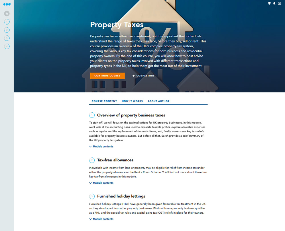 This course provides an overview of UK property business taxes, the eligibility criteria for tax-free allowances, and the appropriate tax treatment for furnished holiday lettings (FHLs). You’ll also learn about other property tax issues that you need to be familiar with, enabling you to offer your clients the best advice about various property taxes in the UK.