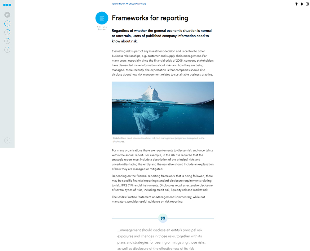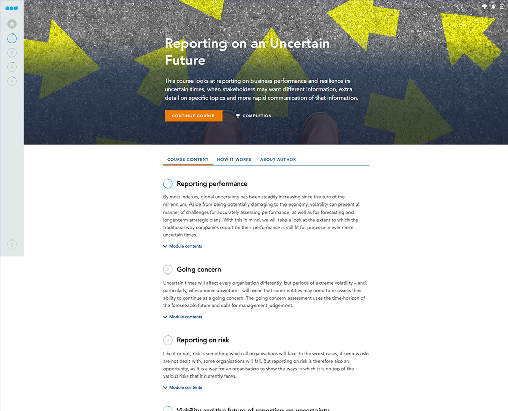 This course provides insight into reporting during times of uncertainty. It assesses whether traditional reporting is still relevant and considers how reporting requirements are likely to change. You will gain insight on how to portray the future of your business through your reporting and illustrate how you will handle the risks that it is likely to face.