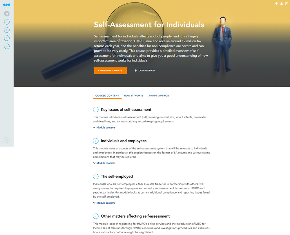 This course outlines the key principles of the UK’s self-assessment regime for individuals. You’ll explore who needs to complete a return, the required timescales, what records must be kept, and how claims and elections are made. The course also covers compliance issues for the self-employed, registering for HMRC’s online services, and handling enquiries or investigations.