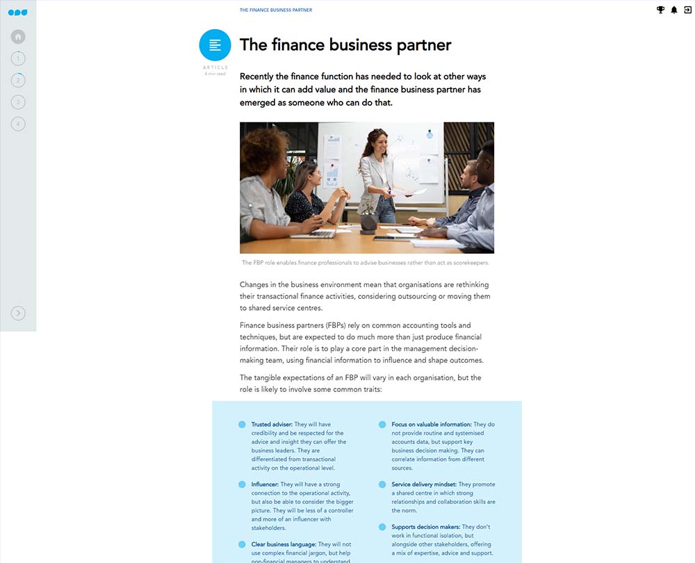The finance business partner plays a key strategic role in a business, and, has the opportunity to become a trusted business advisor. This requires a different set of skills to the traditional finance back-office function. You will be expected to be strategic, focusing on the value of the information you provide, and extracting and correlating financial figures to help your business make relevant decisions, which are closely aligned with your strategic outcomes.
