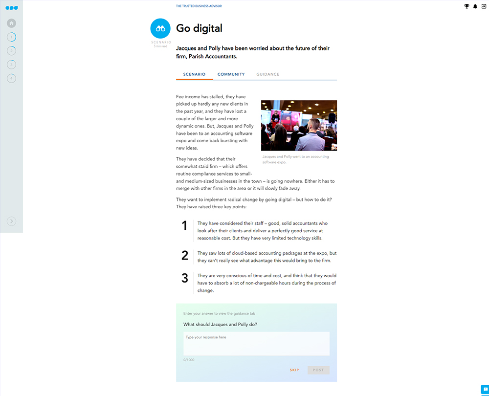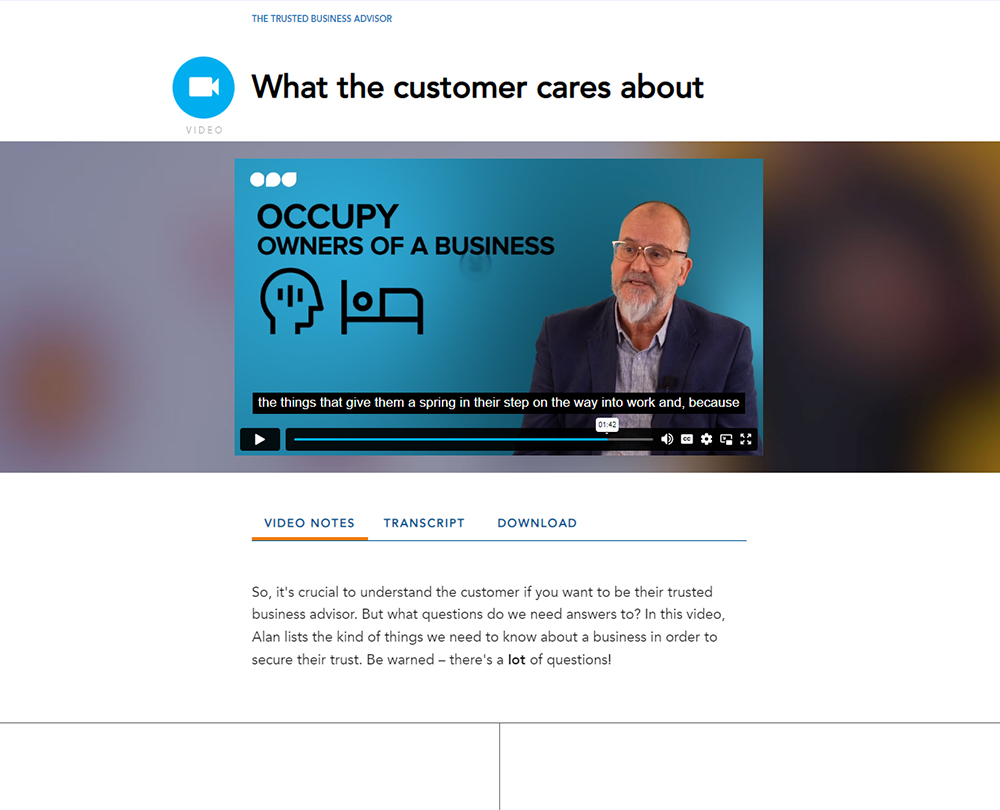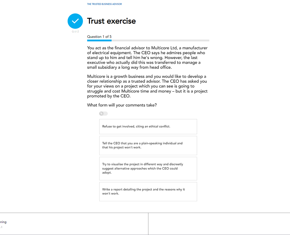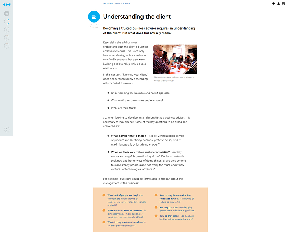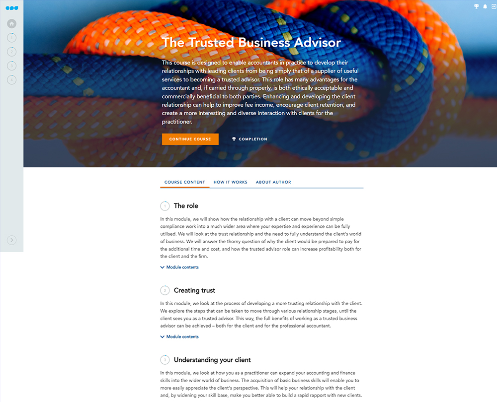 This course explores how you can develop stronger relationships with your clients and how you can transition from being purely a supplier of useful services to becoming a trusted business advisor. It will help you to better understand your clients’ businesses and identify areas of pain and opportunity so you can add real value. You’ll also explore how keeping up with technology like CRM and enhancing communications with your clients can benefit both sides.
